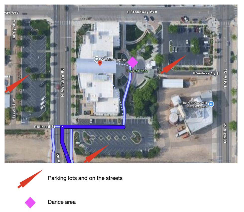Parking for May 2, Flash Mob at Meridian Main Street Market, 10:30 am